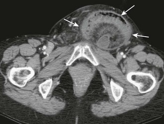 When findings on physical examination are equivocal and the emergency clinician suspects an occult hernia, several options are available for diagnostic imaging.31 Magnetic resonance imaging has a high positive predictive value for patients with clinically uncertain herniations,32 and computed tomography can also be helpful for the diagnosis of hernias and any associated complications (e.g., bowel obstruction or perforation)33 (Figs. 44-6 and 44-7). Ultrasound examination has been shown to have good sensitivity and specificity for the diagnosis of groin hernias34 and may decrease the rate of emergency surgery by improving the ability to reduce hernias.35 Ultrasound may also have good specificity and a high positive predictive value for diagnosing postoperative incisional hernias.31