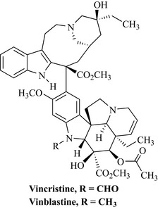 The discovery of the vinca alkaloids from the Madagascan periwinkle is a classic example of drug discovery and, although extracts of the species had a reputation as being useful in the treatment of diabetes, a screening programme at the pharmaceutical company Eli Lilly revealed that extracts inhibited the growth of certain types of cancer cells. Bioassay-guided isolation of extracts of the plant led to the characterization of the active alkaloidal compounds vincristine and vinblastine (Fig. 8.12).