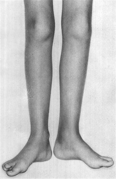 In the child, the center of gravity is at the level of the twelfth thoracic vertebra. As the child grows older, the center of gravity drops, eventually reaching the level of the second sacral vertebra in adults (slightly higher in males). The child stands with a wide base to maintain balance, and the knees are flexed. The knees are slightly bowed (genu varum) until about 18 months of age. The child then becomes slightly knock kneed (genu valgum) until the age of 3 years. By the age of 6 years, the legs should naturally straighten (Figure 15-4). The lumbar spine in the child has an exaggerated lumbar curve, or excessive lordosis. This accentuated curve is caused by the presence of large abdominal contents, weakness of the abdominal musculature, and the small pelvis characteristic of children at this age.