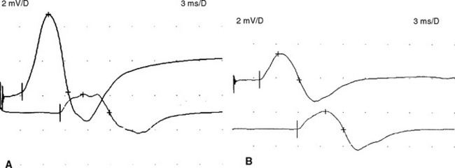 Electrophysiologic evidence of definite demyelination requires the presence of demyelination in at least two motor nerves with no evidence of coexisting entrapment syndromes. During the first two weeks of illness, slowing of conduction velocity in the demyelinating range (e.g., less than 70–80% of the lower limits of normal) is present in less than 25% of patients. Conduction block in one or more motor nerves, a strong evidence for acquired demyelination, is present in less than 30% of patients (Figure C23-2).