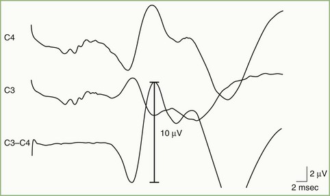 An important application of SEP is as an aid to prognosis in patients resuscitated following cardiopulmonary arrest. In that setting, bilateral absence of the N20 is accurately predictive of a poor neurological outcome (Wijdicks et al., 2006) (Fig. 32A.34).