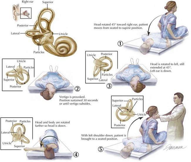The diagnosis of BPPV in large part depends on the clinical history and bedside testing. The Dix-Hallpike maneuver, when performed and interpreted properly is diagnostic. Studies suggest that the Dix-Hallpike maneuver has a sensitivity and specificity of approximately 75%. In our experience the ability to perform the maneuver properly in anxious patients fearful of provocative maneuvers is a major limiting factor for accurate evaluation. Risk factors for BPPV include recent head trauma (which can be relatively minor); otologic surgery or disease; habitual unusual positioning such as is a daily occurrence for plumbers, mechanics, and yoga enthusiasts; or advanced age. Particle repositioning maneuvers or canalith repositioning maneuver is the main treatment for benign paroxysmal positional vertigo (Fig. 8-7). Another maneuver known as the liberatory maneuver, developed by Semont et al., relies on rapidly swinging the patient from lying initially on the involved side through 180 degrees to the opposite, uninvolved side. Unfortunately any repositioning maneuver can be limited by the inability of the patient to physically participate (musculoskeletal and orthopedic limitations, especially of the head and neck) or when induced symptoms are intolerable. In 5% of patients, symptoms may worsen with repositioning maneuvers in part due to conversion from posterior to horizontal canal involvement. Outcome studies regarding the effectiveness of the canalith repositioning maneuver provide a range of reported success, as most studies rely on subjective reporting, which is inherently unreliable because patients quickly develop adaptive behavior spontaneously. Overall, however, there is evidence to favor repositioning maneuvers, with some studies demonstrating resolution of symptoms in 90% of patients after only one treatment. Self-administered maneuvers in combination with guided treatments can often help expedite improvement in the remaining patients. Successful treatment with the repositioning maneuvers does not influence recurrence rate, which averages around 20% over a 20-month period. Persistent vertigo or frequent recurrences of BPPV is uncommon, but under such circumstances surgical occlusion of the posterior semicircular canal with bone grafts and fibrin glue is an effective treatment. Medications can provide temporary relief by controlling nausea and suppressing the vestibular responses. Meclizine and benzodiazepines are the most frequently prescribed medications but can be sedating and should be used only for a few days.