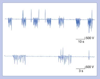 Myokymia is frequently readily observable as vermicular (bag of live worms) or rippling movement of the skin. It is usually associated with myokymic discharges.14 The myokymic discharge consists of bursts of normal-appearing motor units with interburst intervals of electrical silence. Typically, the firing rate is 0.1 to 10 Hz in a semirhythmic pattern. Two to 10 potentials within a single burst can fire at 20 to 150 Hz. These potentials are not affected by voluntary contraction (Figure 9-22). The sound associated with these potentials is a type of sputtering often heard with a low-powered motorboat engine. The actual discharge may be distinguished from CRDs in that myokymic discharges do not display a regular pattern of spikes from one burst to the next, nor do they typically start and stop abruptly. Myokymic discharges are groups of motor units, while CRDs represent groups of single muscle fibers. The groups of motor units within a burst may fire only once or possibly several times. The sputtering bursts of myokymic discharges sound quite different than the continuous drone of a CRD.