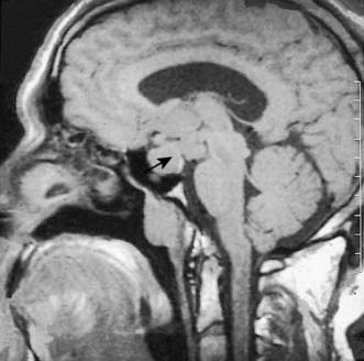 Functioning pituitary adenomas may result from over-stimulation by hypothalamic factors. Initially small and confined within the gland (microadenomas), they grow slowly and can ultimately expand the sella turcica. Eccentric enlargement is common. Upward extension of the adenoma may stretch the diaphragm or herniate through it, to compress the optic chiasma and cause visual defects. It is therefore important that pituitary adenomas are detected before they enlarge the fossa or extend above it. CT with contrast enhancement and MRI (Fig. 20.12) are used to image the tumour. Three endocrine syndromes caused by anterior pituitary disorders have surgical relevance.