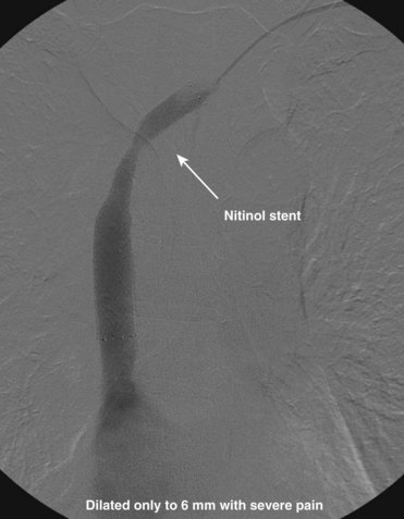 The central venous stenosis not only can be symptomatic with severe arm swelling but also may limit the function of a hemodialysis access. The treatment of central vein stenosis associated with hemodialysis is traditionally angioplasty. Unfortunately, the 1-year patency of these treatments has been reported to be between 10% and 30%, and the use of multiple additional procedures to maintain secondary patency is the rule. The initial use of stents to treat central venous stenosis has been discouraged because of a similar patency rate to that of angioplasty and the possibility of stent compression in the thoracic outlet. In addition, there are no U.S. Food and Drug Administration (FDA)–approved uncovered stents for the venous system. Even though the results from angioplasty are limited, endovascular dilatation of these stenoses is preferred over surgical options because of its availability, noninvasiveness, low risk of morbidity, and ability to repeat as needed. DOQI guidelines recommend stent placement for central lesions that recur within 3 months after angioplasty and demonstrate immediate vessel recoil greater than 50% after angioplasty and vessel perforation. The patency of a stent in central venous stenosis is similar to that of angioplasty, but the ability of retreatment becomes limited (Figs. 18-12 and 18-13). The use of covered self-expandable stents has shown promise, particularly in the setting of peripheral dialysis graft anastomotic stenoses. Their use will likely increase in the central veins; however, the operator needs to be careful in not excluding other draining veins with a central covered stent.