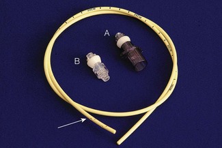 A development of the bougie is the airway exchange catheter (AEC) (Fig. 12.16). A semi-rigid, hollow catheter with interchangeable 15 mm ISO male and Luer-Lok connectors, this is designed to allow tracheal tubes to be exchanged whilst retaining the ability to oxygenate the lungs. The AEC is inserted through the tracheal tube, which can then be removed and exchanged over this. Once in place, the end connector can be fastened, gas sampled from the tip to detect carbon dioxide and correct position confirmed. Oxygen can then be injected or insufflated through the catheter with either a high-pressure injector or a standard anaesthetic breathing system. With the connector removed, a tracheal tube can be guided over the catheter and into the trachea.32 The catheters are available to fit within tracheal tubes down to 3 mm internal diameter.