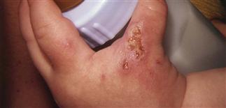 Neonatal herpes. Widespread vesicles and erosions in 2-day-old.