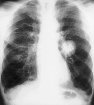 When a pulmonary mass is clearly defined around its entire circumference and is projected over the lung on frontal and lateral projections, the mass is truly intrapulmonary (Figure 7-50). If a surface is in contact with another soft tissue structure, however, the possibility of an extrapulmonary mass projecting into the lung must be considered. Analysis of the breadth of the base of the lesion, the angle made with the adjacent structure, and the presence of bone destruction often allows the observer to differentiate an extrapulmonary mass that extends into the adjacent lung from an intrapulmonary mass that has grown to contact the mediastinum, diaphragm, or chest wall.