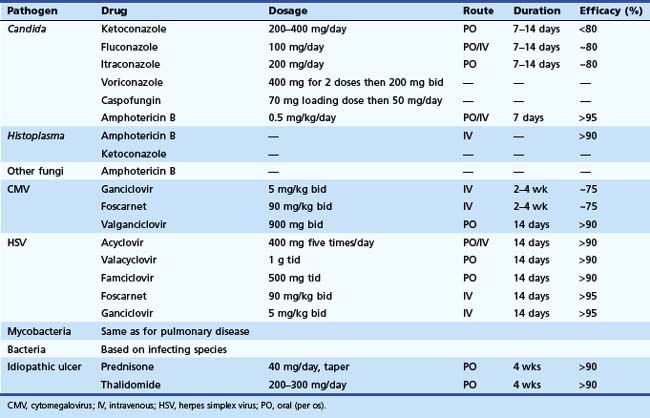 Effective antimicrobial therapies are available for most GI infections (Table 22.2). The pathogen rather than the organ of involvement dictates the treatment regimen. Systemic therapy should be provided for patients with severe disease and associated immunodeficiency. In the normal host, many infections are acute and self-limited and require no specific therapy. Antimicrobial therapy may be contraindicated and potentially harmful with some infections, such as E. coli O157H7, in which antibiotic therapy may be associated with hemolytic uremic syndrome in children.106 For HIV-infected patients, treatment of the underlying immunodeficiency with highly active antiretroviral drugs is quite effective and is fundamental to the treatment of any opportunistic infection in this setting. Antiretroviral therapy alone can result in remission of some opportunistic infections and AIDS-associated neoplasms, which underscores the importance of immune reconstitution in any setting.107,108 Likewise, in a transplant patient, reducing the dosage of immunosuppressive drugs, when possible, plays an important adjunctive role in the management of any opportunistic infection.