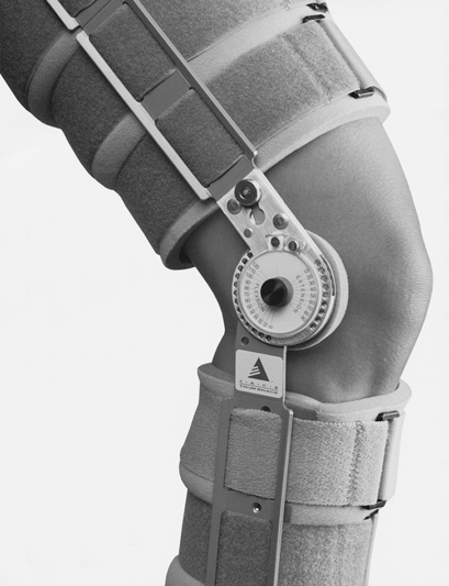 Rigidly immobilized joints produce chemical and morphologic changes in ligaments 2 and 4 weeks following injury, respectively.9 After 8 weeks of immobilization, ligaments lose 20% of their weight; significant atrophy results, and marked infiltration of periarticular connective tissue is observed surrounding the ligament.9 Although immobilization may be needed to promote healing of damaged tissues, the extended use of rigid immobilization should be limited. As an alternative, limited range of motion braces (Fig. 8-1) can be used to protect healing structures and decrease unwanted external forces, as well as allow for progressive motion of involved joints to minimize the negative effects of immobilization.