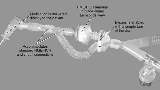 A permanent or a disposable circuit may be selected, based on the type of ventilator on which it must be placed. A circuit with an external exhalation valve must be used with older ventilators such as the Bennett MA-1 (Covidien-Puritan Bennett) and the Bear 2 (Cardinal Health, Viasys Bear Medical Systems, Palm Springs, CA). In addition, if a Bird-series unit is used as a ventilator, its circuit has an external exhalation valve (see Figure 15-24, A). All modern electrical and microprocessor ventilators feature an internal exhalation valve and do not need one included in the circuit (see Figure 15-24, B). If the patient must receive aerosolized medications, the circuit should include a nebulizer or should be able to accept one. If not included, the nebulizer or metered-dose inhaler adapter must be added into the inspiratory limb of the circuit (Figure 15-27).