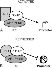 FIGURE 5-6 Transcriptional repression mechanisms. Transcriptional activation can occur by recruitment of a coactivator that binds to the corepressor binding surface. Transcriptional activation is mediated by a corepressor that binds the coactivator surface. In some cases, these proteins may be the same as coactivators and corepressors that mediate TR actions at classical TREs, with reversed functions.