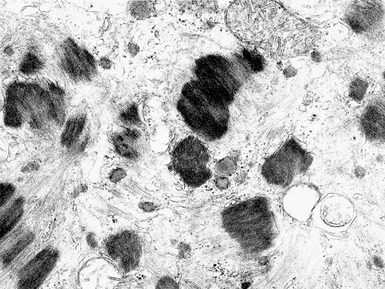 Fig 17.28 Electron micrograph of a muscle biopsy from a patient with Pompe’s disease. There are large collections of sarcoplasmic glycogen (see also Fig 17.29).