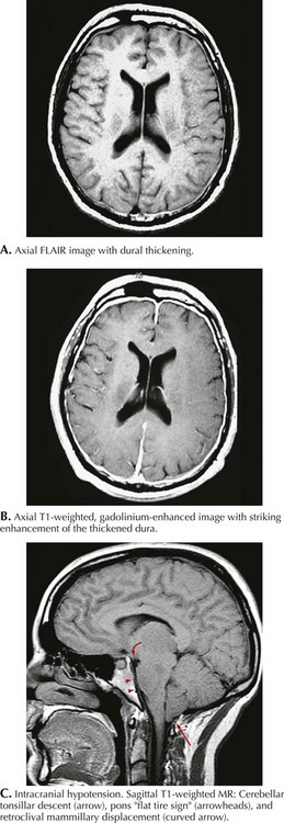 MRI with gadolinium demonstrates diffuse pachymeningeal enhancement in most low–CSF pressure headaches. This is often accompanied by dural thickening that can be striking and may be confused with leptomeningeal inflammatory or neoplastic processes (Fig. 11-9). In more severe cases, subdural fluid collections and descent of the brain with downward displacement of the cerebellar tonsils can be seen. Lumbar puncture demonstrates decreased intracranial pressure, usually less than 50 mm H2O. CSF analysis may be normal, but slight elevation of protein and a mild lymphocytic pleocytosis may be seen. Radioisotope cisternography or contrast myelography can be used to detect sites of CSF leakage.