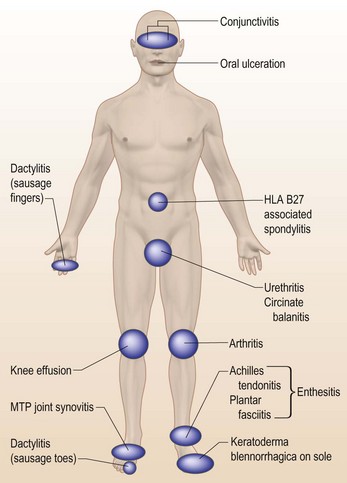 The most common diagnosis in a young man with a monoarthritis is a reactive arthritis associated either with diarrhoea or with urethritis, usually chlamydial in origin (Fig. 8.14). However, clinical questioning with this man has excluded any associated features that would point to reactive arthritis (a triad of urethritis, arthritis and conjunctivitis – Reiter’s disease)and septic arthritis should be considered as the most likely diagnosis, raising the possibility of HIV disease.