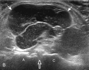 Lymph node enlargement and other masses can be seen during ultrasound evaluation of the shoulder. A normal axillary lymph node appears oval, with a hypoechoic cortical rim (which decreases in thickness in older age), hyperechoic hilus, and a hilar pattern of vascularity if any. The central hyperechoic area is the result not of fat but rather of the reflective interfaces between the sinusoids and fat (Fig. 3-111A). An axillary lymph node that demonstrates eccentric thickening of the cortex, diffuse thickening of the cortex with hilar thinning, absence of the hilum, roundness, or a peripheral vascular pattern on color or power Doppler imaging suggests malignancy.84 A strict size criterion is not effective because even lymph nodes smaller than 5 mm (largest diameter) have almost 10% risk for malignancy in the setting of breast cancer.85 Often, ultrasound-guided percutaneous or excisional biopsy is required (see Fig. 3-111B and C; Fig. 3-112). Other soft tissue masses, if not originating from a synovial joint, are often not specific for one diagnosis, and ultrasound-guided percutaneous biopsy is usually required.