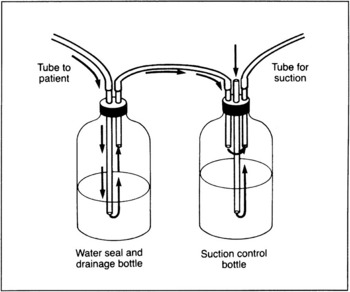 5. The respiratory therapist notices on a patient’s chest tube drainage system that there is fluctuation of the water level in the water-seal chamber with each patient breath and air bubbles seen only in the suction control chamber, which has a suction pressure of −15 cm H2O. The most appropriate action is which of the following?