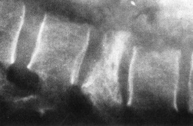 Figure 13-4 COMPRESSION FRACTURE OF L2 VERTEBRA IN A PATIENT WITH SEVERE β-THALASSEMIA.