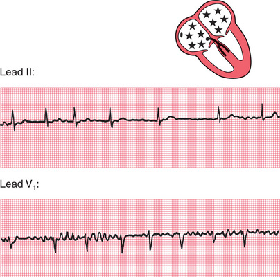 If a focus in the ventricular muscle depolarizes with a high frequency (causing, in effect, rapidly repeated ventricular extrasystoles), the rhythm is called ‘ventricular tachycardia’ ( Fig. 3.22).