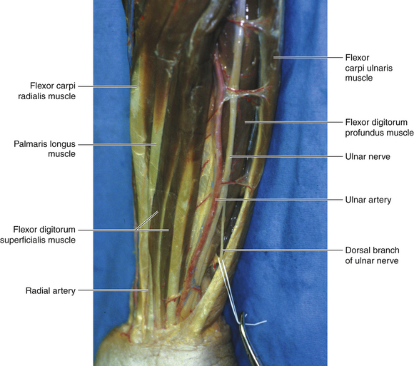 • As the ulnar artery passes distally, it runs medially and obliquely to reach the ulnar nerve at the middle of the forearm (Figures 12-7 and 12-8). The ulnar nerve emerges superficially from under cover of the flexor carpi ulnaris just above the wrist, lying medial to the artery and lateral to the tendon.