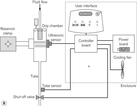 In these devices the fluid passes through a special cartridge that brings it into indirect contact with an electrically heated metal plate. The temperature of the plate is set to 40°C (rather than 37°C) to compensate for the loss of heat over the length of line between the warmer and the patient. Small warmer units are also available that can be placed close to the patient’s infusion site (Fig. 30.7). The water channel of the cartridge is made from plastic with one side bonded to an aluminium-serrated plate. The latter is placed in direct contact with the heater element and is responsible for the transfer of heat to fluid passing through the plastic channels in the cartridge.